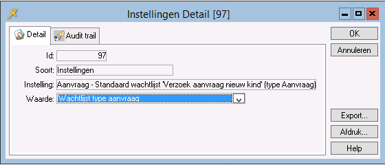 Met de parameter Aanvraag – Standaard wachtlijst 'Verzoek aanvraag nieuw kind'(type Aanvraag) kunt u aangeven welke waarde getoond gaat worden in de kolom Wachtlijst. Door een selectie of een sortering te maken op deze waarde krijgt u een indruk hoeveel ouders via het klantportaal opvang aanvragen voor hun kind voor een andere Opvangsoort.