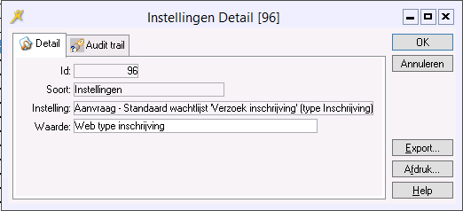 Met de parameter Aanvraag – Standaard wachtlijst 'Verzoek inschrijving' (type Inschrijving) kunt u aangeven welke waarde getoond gaat worden in de kolom Wachtlijst. Door een selectie of een sortering te maken op deze waarde krijgt u een indruk hoeveel ouders via het inschrijvingsportaal zichzelf en hun kind inschrijven en voor het kind opvang aanvragen.