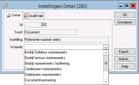 Met de instelling van deze parameter bepaalt u welke nummerreeks gebruikt zal worden voor het genereren van een uniek referentienummer voor een nieuw document.