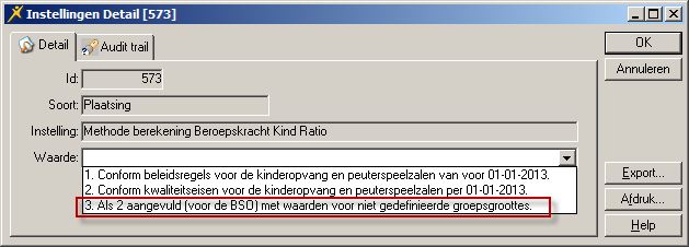 De systeemparameter Methode berekening Beroepskracht Kind Ratio is uitgebreid met de keuzemogelijkheid Als 2 aangevuld (voor de BSO) met waarden voor niet gedefinieerde groepsgroottes. U vindt de parameter op tabblad Plaatsing (Beheer>Systeembeheer>Instellingen). Er zijn nu drie opties: