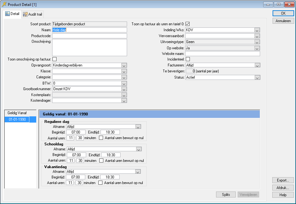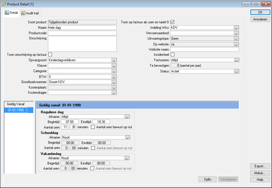 welke begin- en eindtijden elk product heeft