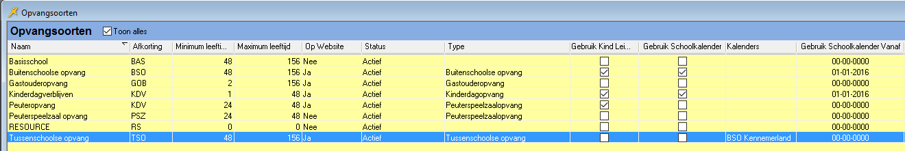 Kalenders: Als er een Opvangsoort aan een Basiskalender gekoppeld wordt toont deze kolom de naam van de betreffende Basiskalender.