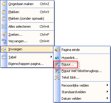 Plaats de cursor op de plek waar u een afbeelding wilt toevoegen (*1), klik rechts en kies in het contextmenu Invoegen>Figuur... (*2).