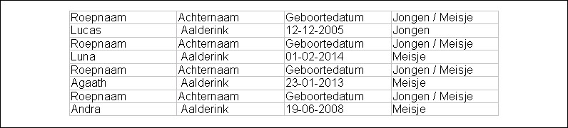 Als het wenselijk is om bepaalde zaken uit een schema te herhalen in een tabel dan moet de tabel worden voorzien van een koptekst waarin kolomnamen komen. Door deze koptekst met kolomnamen buiten de groepstart en groepeind van de in te voegen velden te houden krijgt u bij het maken van een document op basis van dit documentsjabloon de gegevens onder elkaar. Doet u dit niet dan zal de koptekst bij het maken van een document telkens herhaald worden. Van beide resultaten hieronder een voorbeeld.