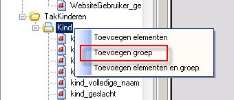 Scrol in de lijst Elementen naar de TakKinderen, ga met de muis op de groep Kind staan en klik rechts en vervolgens voor Toevoegen Groep. U ziet het volgende venster: