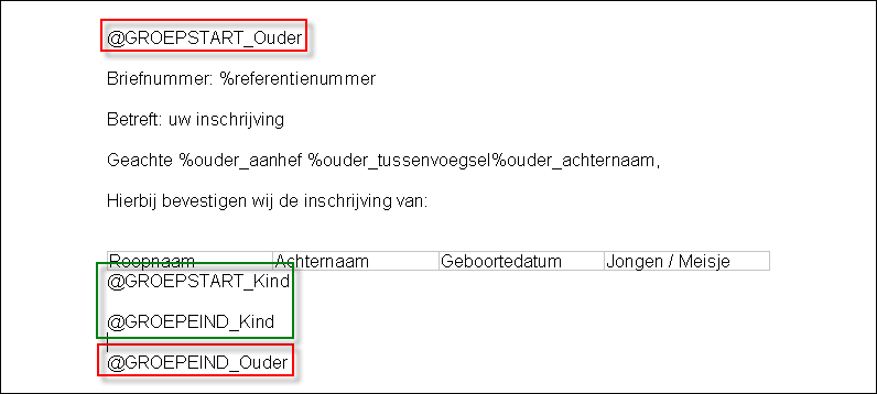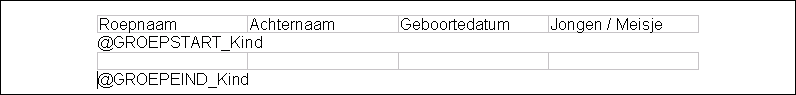 Zet vervolgens de cursor onder deze tabel om de groepstart en groepeind toe te voegen waarmee u de elementen (velden) voor kindgegevens kunt toevoegen. Deze groepstart moet geplaatst worden tussen de groepstart en groepeind van de groep @GROEPSTART_Ouder / @GROEPEIND_Ouder.