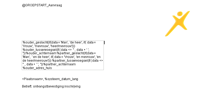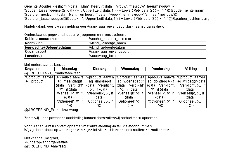 Als u alle uitleg gevolgd heeft bent u in staat om zelfstandig een documentsjabloon te maken. Hier geven wij een voorbeeld van een documentsjabloon van een bevestiging inschrijving voor opvang voor de kinderopvang.