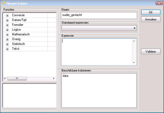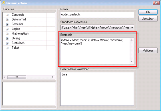 Klik met de cursor op het veld %ouder_geslacht en klik vervolgens rechts en kies voor Expressie. U ziet het volgende venster: