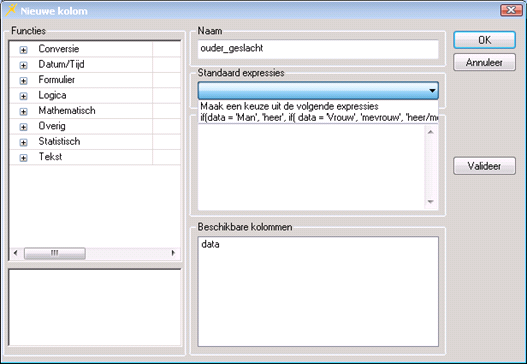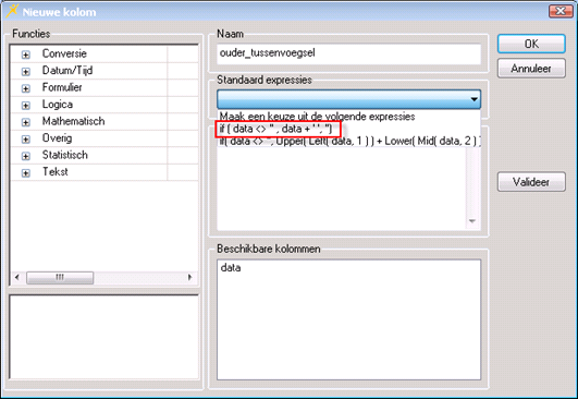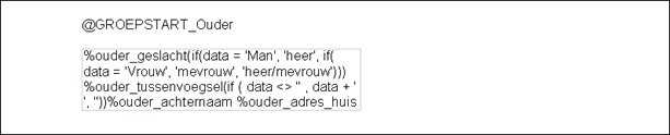 Wanneer u ervoor kiest om geen voorletters in een adres te gebruiken is het nodig om het veld %ouder_tussenvoegsel toe te voegen en te voorzien van een standaardexpressie. Deze expressie zorgt ervoor dat bij ouders die geen tussenvoegsel in de achternaam hebben geen tussenvoegsel wordt toegevoegd maar wel een spatie. Voor ouders met een tussenvoegsel wordt het tussenvoegstel getoond en wordt er direct een spatie na het tussenvoegsel toegevoegd. Daarom komt er tussen het veld %ouder_tussenvoegsel en %ouder_achternaam geen spatie.
