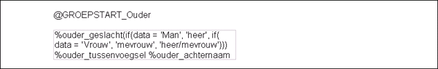 In deze procedure maken we een adres zonder de voorletters van de ouders. Als u wilt dat ook de voorletters van een ouder er in komen dan kiest voor de velden %ouder_geslacht en %ouder_volledige achternaam. U kunt dan het veld %ouder_tussenvoegsel weglaten.