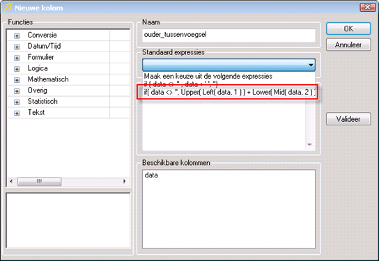 Klik nu met de linkermuisknop op het veld %ouder_tussenvoegsel en kies in het contextmenu voor Expressie en klik op Standaard expressies. U ziet het volgende venster: