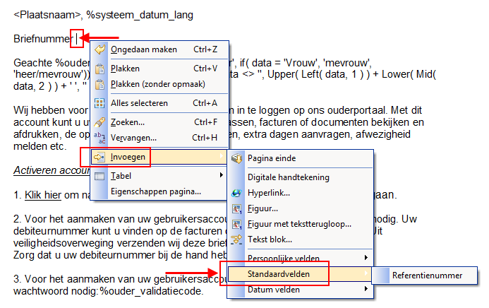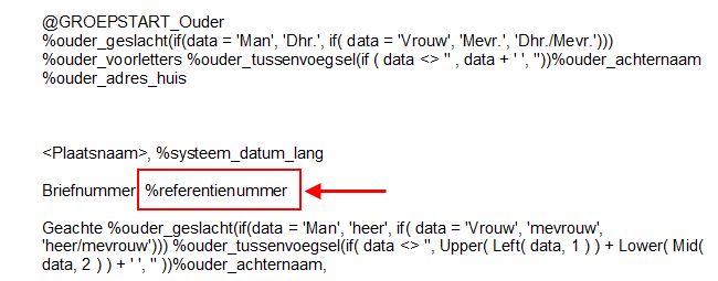 U kunt aan een document een referentienummer toekennen, bijvoorbeeld het briefnummer. U gebruikt hiervoor de optie Invoegen > Standaardvelden > Referentienummer. Door het veld Referentienummer toe te voegen aan een documentsjabloon krijgt elk gemaakt document op basis van dit sjabloon een referentienummer mee.