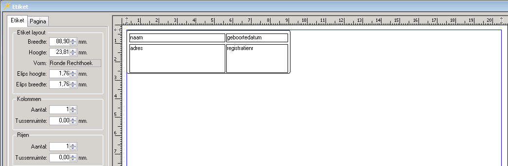 LET OP! Het is niet mogelijk om tekstvelden en plaatjes in het etiket te verplaatsen of van grootte te veranderen met behulp van de muis. Om tekstvelden en plaatjes in het etiket te verplaatsen gebruikt u de pijltoetsen van het toetsenbord. Om de grootte van de velden te wijzigen gebruikt u de pijltoetsen in combinatie met de SHIFT-toets.. Voor de opmaak zie Wijzig koptekst eerste pagina.