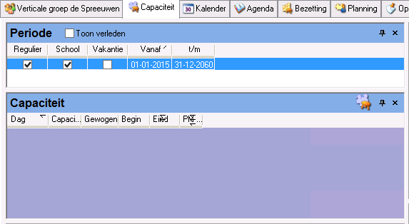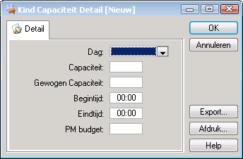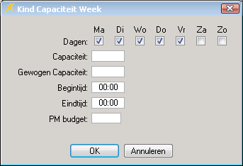 U kunt de capaciteit van een opvanggroep voor elke weekdag apart invullen. Wanneer u echter voor meerdere weekdagen dezelfde openingstijden en maximale capaciteit heeft kunt u de capaciteit ook voor meerdere weekdagen tegelijk invullen. In het ene geval gebruikt u de menufunctie Nieuw... en in het nadere geval Maak week...