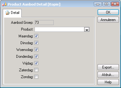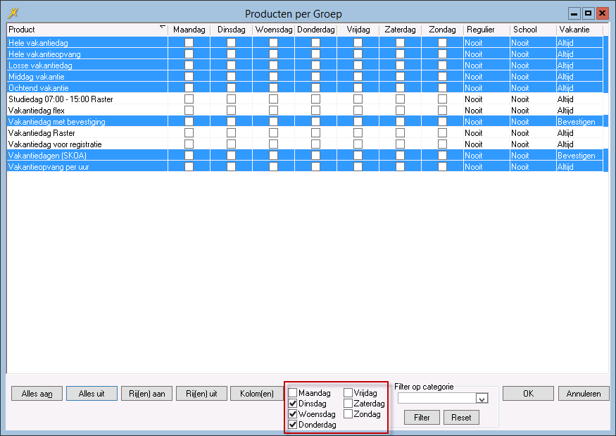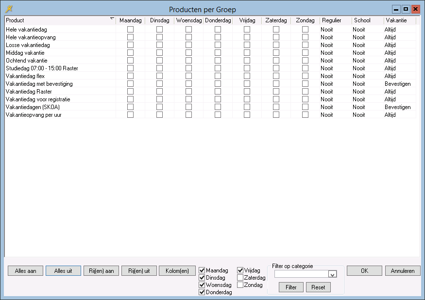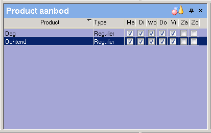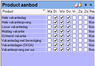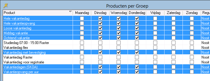 Alleen de ‘overgebleven’ producten die horen bij de opvangsoort van de groep worden getoond. Dus alleen de producten die nog niet in het aanbod van de groep zijn opgenomen. Het product Dag uit dit voorbeeld zal dus niet meer getoond worden. Zo kunt u eenvoudig en snel producten kopiëren. |