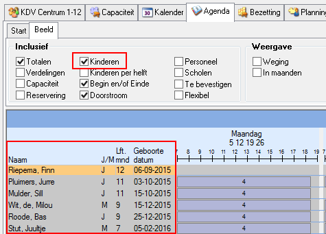 In de Agenda Informatie > (tab) Agenda en in de Groep Informatie > (tab) Agenda staat op het tabblad Beeld het selectievakje Kinderen.