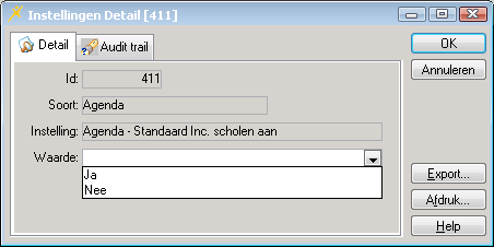 De applicatie instelling Agenda - Standaard Incl. Kinderen aan heeft de waarde Ja (*). Zonder deze waarde kan de instelling Agenda - Standaard Incl. scholen aan niet werken.