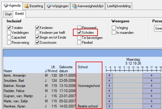 Door de applicatie instelling Agenda - Standaard Incl. scholen aan de waarde Ja te geven wordt het selectievakje Scholen standaard ingeschakeld. Deze keuze zorgt u ervoor dat bij het opvragen van een groepsagenda de namen van de scholen van de kinderen op deze groep getoond worden.