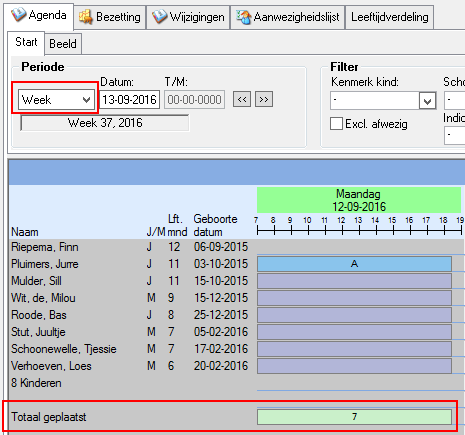 Door de applicatie instelling Agenda - Standaard Incl. totalen aan de waarde Ja te geven wordt het selectievakje standaard ingeschakeld. Hierdoor wordt onderaan de groepsagenda de regel Totaal geplaatst getoond. Deze regel toont het totaal aantal opgevangen kinderen op de groep.