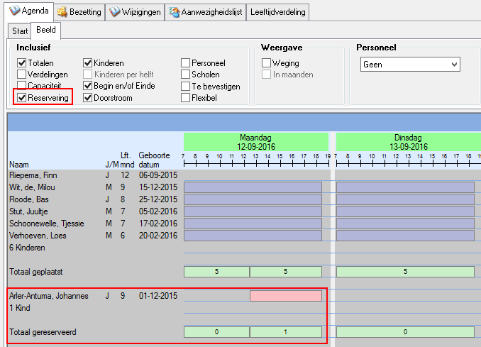 Door de applicatie instelling Agenda - Standaard reserveringen aan de waarde Ja te geven wordt het selectievakje Reserveringen standaard ingeschakeld. Dit zorgt ervoor dat bij het opvragen van de groepsagenda het aantal gereserveerde plaatsingen op deze groep getoond worden in de regel Totaal gereserveerd. Tevens worden de kinderen met een gereserveerde plaatsing getoond.