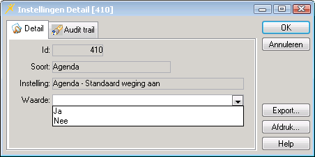 U kunt bij de applicatie-instelling Agenda - Standaard weging aan kiezen uit de volgende waarden:
