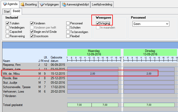 Door de applicatie instelling Agenda - Standaard weging aan de waarde Ja te geven wordt het selectievakje Weging standaard ingeschakeld. Dit zorgt ervoor dat bij het opvragen van de groepsagenda ook de weging - die is ingevoerd op de detailkaart van de geplaatste kinderen - wordt getoond. Zie Gewichtsklassen.