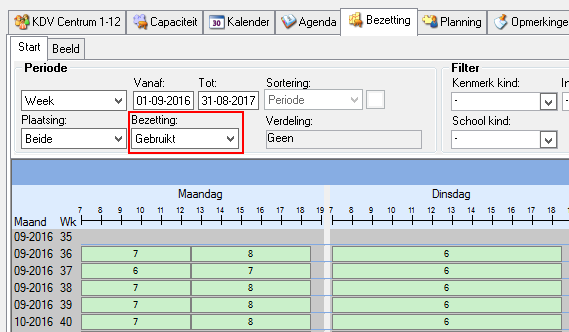 Een planningsmedewerker zal gebruik maken van Beschikbaarheid of Gebruikt, maar als zij bezettingscijfers aanlevert zal zij kiezen voor Bezetting (%) of Bezetting (% 0,00). In het algemeen staat de parameter standaard ingesteld op Gebruikt, zodat in één oogopslag is te zien hoeveel plaats er op een bepaalde dag nog is op een groep.