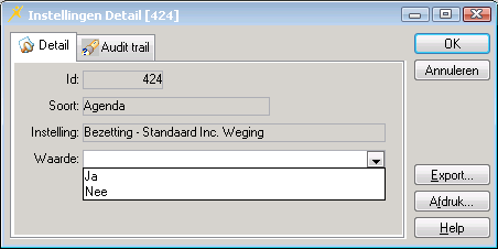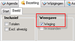 Met de instelling van deze parameter wordt het selectievakje Weging op het tabblad Beeld van een bezettingsoverzicht in het agenda informatiescherm standaard ingeschakeld. Dit zorgt ervoor dat bij het opvragen van een bezetting de de weging die is ingevoerd op de detailkaart van de geplaatste kinderen getoond wordt. Zie Gewichtsklassen.