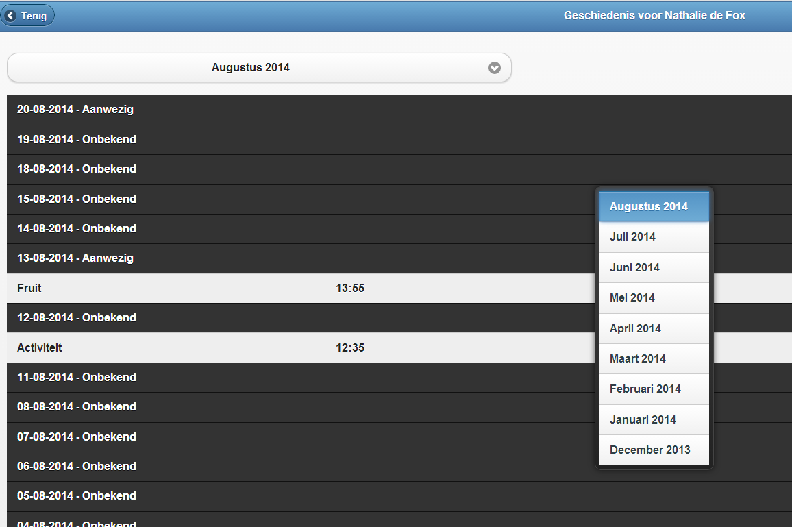 In het scherm met de geschiedenis kan de leid(st)er de maand selecteren die getoond moet worden: