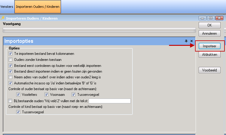 Indien de import geslaagd is kunt u het venster Importeren Ouders/Kinderen sluiten. Indien er in het deelvenster Importverslag foutmeldingen staan dient u deze in het Importbestand aan te passen en de import daarna nogmaals uit te voeren.