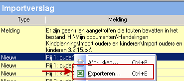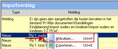 Tijdens het uitvoeren van de Import worden in het deelvenster Importverslag diverse meldingen getoond. Deze meldingen kunt u afdrukken en/of opslaan. Indien een import niet gelukt is en er fouten getoond worden in het Importverslag dan is het zeker aan te bevelen om deze foutmeldingen op te slaan. Aan de hand van deze lijst met meldingen past u het importbestand aan. Na de aanpassing voert u de import opnieuw uit.