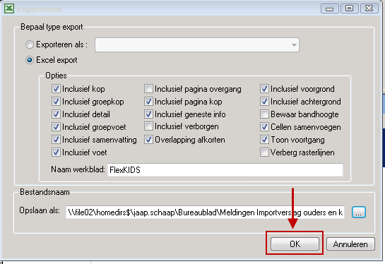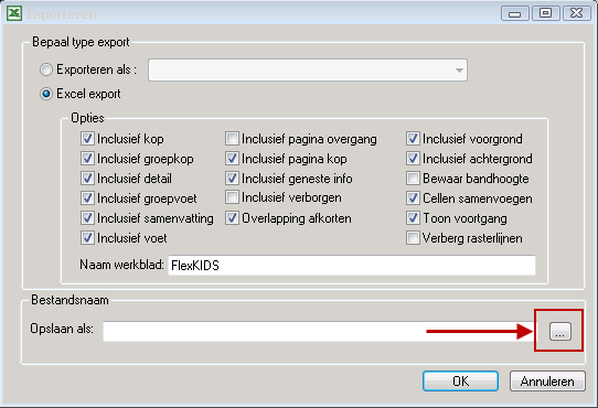 Kies de plaats waar u het bestand wilt opslaan en geef het bestand een voor u herkenbare naam. Klik op de knop Opslaan. De padnaam wordt getoond in het venster Exporteren.