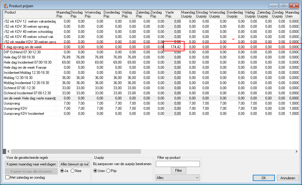 Beheer>Financieel>Prijsafspraken>Prijstabel voor de Dagopvang per keer>(deelvenster) Vaste Prijs.