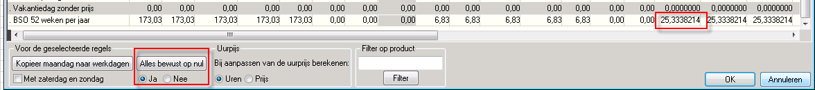 Om te voorkomen dat u bij de invoer van de productprijzen een dergelijk pakket per product een prijs moet gaan meegeven kunt u ervoor kiezen om de prijs per maand en het aantal uren per maand voor het totaalpakket op het product voor de schoolweken te zetten en het product voor vakantieweken geen prijs mee te geven.