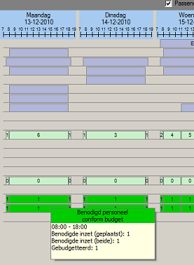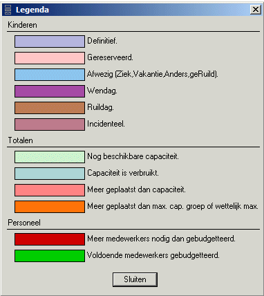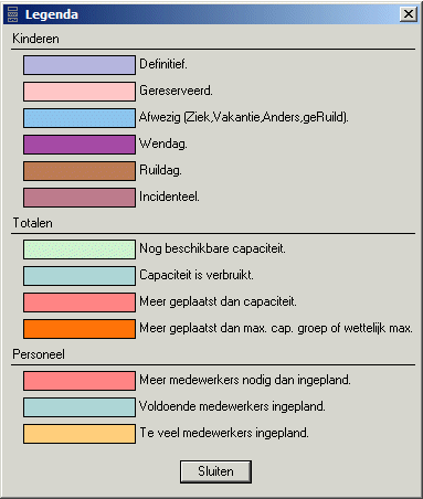 Voor de betekenis van de kleuren kunt u gebruik maken van de legenda. Deze opent u met de optie Legenda… in het contextmenu. Voor de optie Benodigd van het keuzelijstveld Personeel geldt een andere legenda dan voor de optie Ingepland: