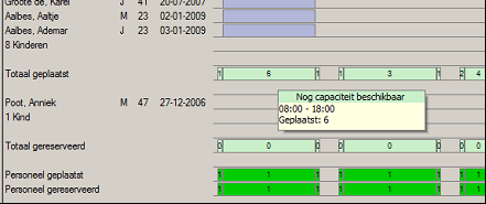 Indien de maximale groepsgrootte (*) wordt overschreden, kleuren de regels Totaal geplaatst en/of Totaal gereserveerd oranje. Dit gebeurt ook indien het wettelijk toegestane aantal kinderen wordt overschreden. Wat betreft het laatste wordt onder andere gekeken naar de samenstelling van de groep (leeftijdsverdeling):