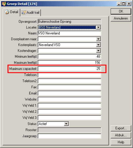 (*) De maximale groepsgrootte (capaciteit) van een groep stelt u in via de detailkaart van een groep. In het veld Maximum capaciteit vult u het maximale aantal kinderen in dat geplaatst mag worden op de groep. Hoe groot dat aantal is hangt af van de door de GGD verstrekte vergunning.