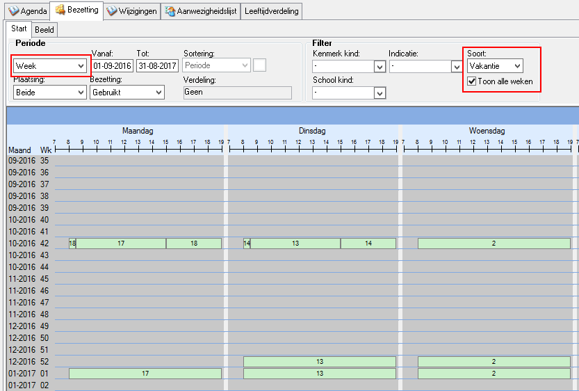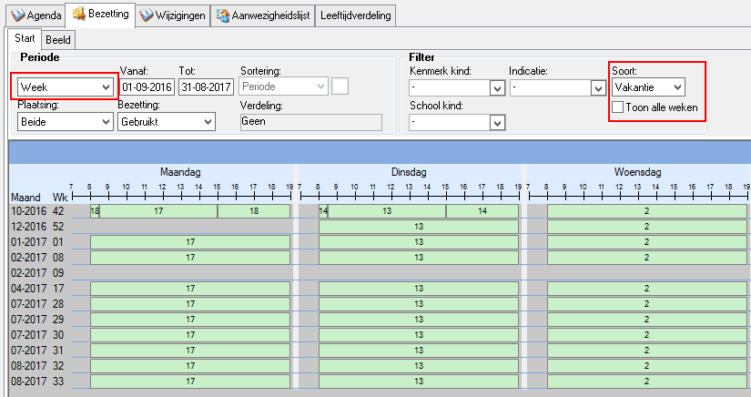 Door de applicatie-instelling Bezetting - Standaard 'Toon alle weken' aan de waarde Ja te geven wordt het selectievakje Toon alle weken standaard ingeschakeld. Toon alle weken aan werkt alleen in combinatie met de periode Week of Week per maand.