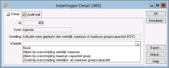 U kunt met de parameter Indicatie meer geplaatst dan wettelijk maximum of maximum groepscapaciteit (KDV) instellen hoe er op het tabblad Agenda van het agenda-informatiescherm rekening zal worden gehouden met het overschrijden van de maximale groepsgrootte. Als dit gebeurt kleuren de regels Totaal geplaatst en/of Totaal gereserveerd oranje. Dit gebeurt ook indien het wettelijk toegestane aantal kinderen wordt overschreden. Wat betreft het laatste wordt onder andere gekeken naar de samenstelling van de groep (leeftijdsverdeling).