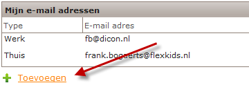 In de sectie Mijn e-mailadressen van de webpagina Mijn gegevens is de knop Toevoegen toegevoegd: