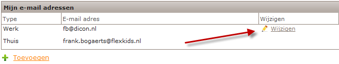 In de sectie Mijn e-mailadressen van de webpagina Mijn gegevens is de knop Wijzigen (*) toegevoegd: