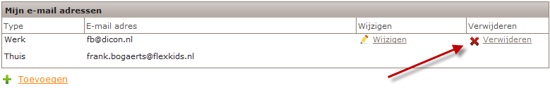 In de sectie Mijn e-mailadressen van de webpagina Mijn Gegevens is de knop Verwijderen toegevoegd:
