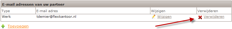 In de sectie E-mailadressen van uw partner van de webpagina Mijn Partner is de knop Verwijderen toegevoegd: