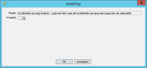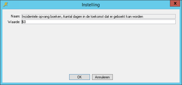 Met de parameter Incidentele opvang boeken, Aantal dagen in de toekomst dat er geboekt kan worden geeft u de periode (in dagen) aan waarbinnen de ouder een incidentele plaatsing kan aanmaken.