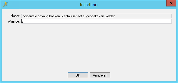Met de parameter Incidentele opvang boeken, Aantal uren tot er geboekt kan worden geeft u de sluitingsperiode op uitgedrukt in aantal uren. De sluitingsperiode bestaat uit twee delen. Het eerste deel is de eerste dag van de sluitingsperiode en wordt uitgedrukt in het aantal uren gelegen tussen sluitingstijd en middernacht. Het tweede deel bestaat uit het resterende aantal dagen van de sluitingsperiode, eveneens uitgedrukt in uren. De uren van beide delen worden bij elkaar opgeteld.