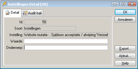 Met de parameter Website mutatie – Sjabloon acceptatie / afwijzing 'Verzoek opzegging opvang' (type Opzegging) stelt u in welk sjabloon gebruikt wordt voor het inbox- en e-mailbericht dat naar de ouder wordt gestuurd zodra het desbetreffende mutatieverzoek is afgehandeld.