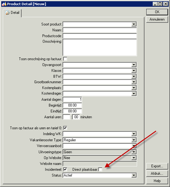 Het product moet zijn ingericht als Incidenteel en Direct plaatsbaar Bij het desbetreffende opvangproduct in flexkids dient het selectievakje Direct plaatsbaar te worden ingeschakeld. Dit selectievakje is pas zichtbaar als ook het selectievakje Incidenteel is ingeschakeld: