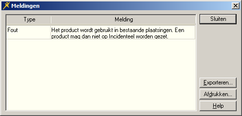 Als het product al voorkomt in plaatsingen die in het verleden zijn aangemaakt, dan kan het product niet meer als incidenteel worden ingericht. In dat geval verschijnt een foutmelding (*) na klikken op OK:
