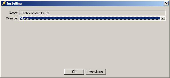 Om het gebruik van sterke (moeilijk te raden) wachtwoorden te bevorderen kan deze parameter worden ingesteld op Streng. In dat geval moet het ingevoerde wachtwoord minstens 8 tekens lang zijn, en tenminste 1 cijfer bevatten. Deze instelling geldt overigens voor alle nieuw ingevoerde wachtwoorden. Dus ook bij het wijzigen van een wachtwoord geldt dat het nieuwe wachtwoord aan voornoemde eisen moet voldoen.