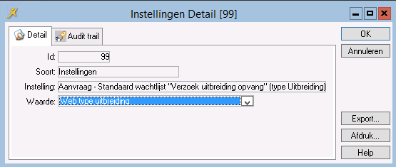 Met de parameter Aanvraag – Standaard wachtlijst 'Verzoek uitbreiding opvang' (type Uitbreiding) kunt u aangeven welke waarde getoond gaat worden in de kolom Wachtlijst. Door een selectie of een sortering te maken op deze waarde krijgt u een indruk hoeveel ouders via flexweb voor hun kind uitbreiding van de plaatsing binnen dezelfde opvangsoort aanvragen.